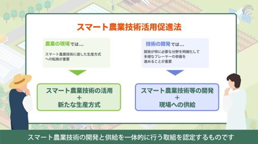 本動画では、こうした大きな課題を解決するためにスマート農業が果たす役割を、アニメーションを用いてわかりやすく解説しています。また、スマート農業を進めていく上で必要となる、生産方式の転換、技術等の開発と普及について、スマート農業技術活用促進法と合わせて紹介しています。