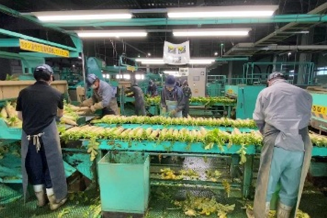 だいこん洗浄選別施設では、収穫後の土・葉付きの約1kgのだいこんを人手で仕分けし、葉の向きを揃えて整列し、葉切り・洗浄装置及び選別装置へ整列供給する作業を行っています。高重量かつ滑りやすい作業のため労働負荷が高い作業であり、施設全体の約6割を本作業に充てています。また、農村地域の人口減少もあり人員確保に苦慮しています。