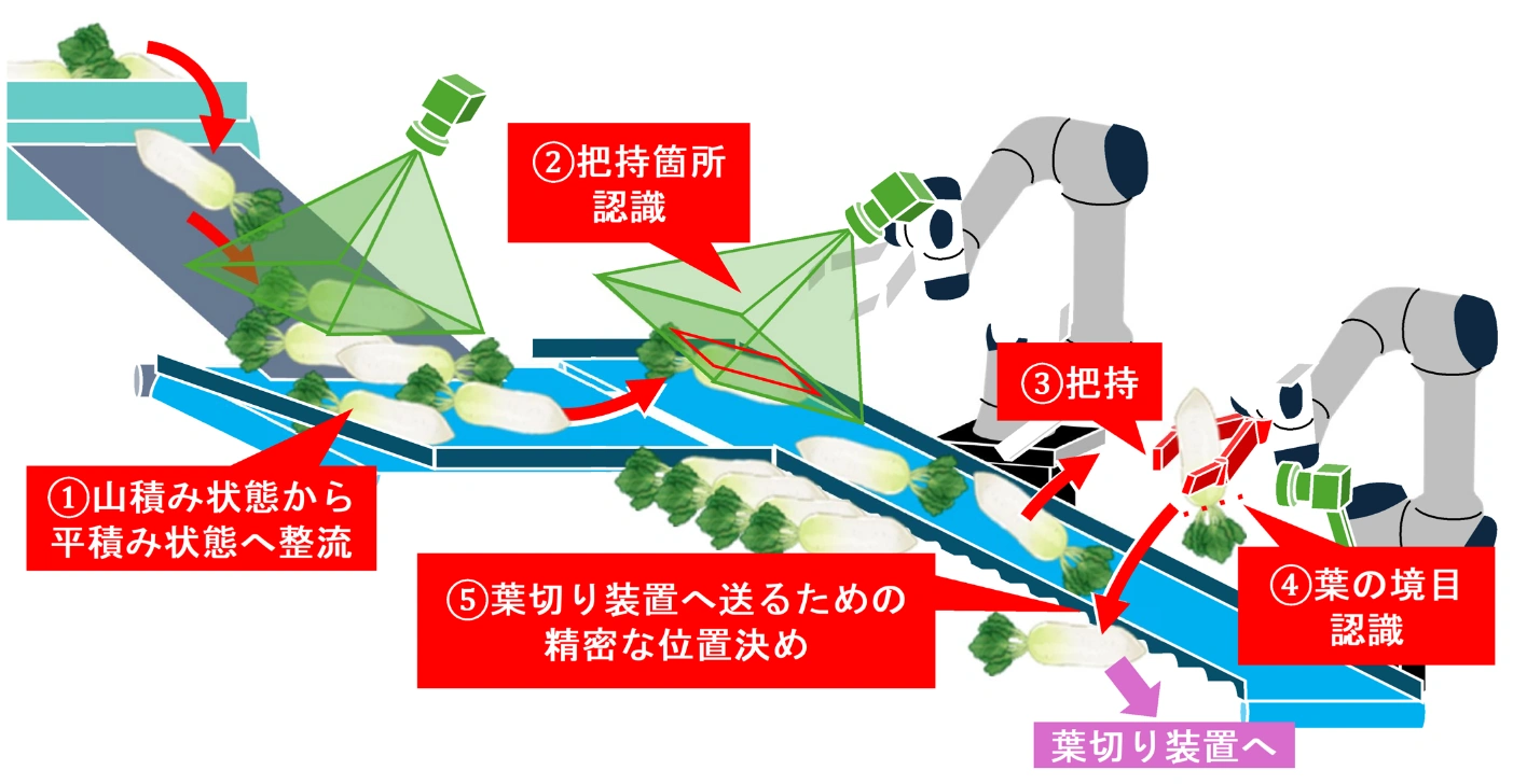 ーーだいこんの葉切り・洗浄設備や選別機への、ロボットハンドでの自動搬入システムーー