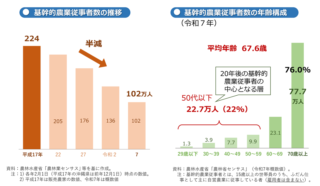 A. 日本の農業現場では、生産者の減少が問題になっています。農林水産省の調査では、今後20年間で、基幹的農業従事者は現在の約1/4にまで減少することが見込まれています。実際に、令和7年までの20年間で、基幹的農業者数は半減しています。このような人口減少下において、将来にわたって持続的に農業生産を行うためには、省力化・効率化を図ることが重要です。そこで、スマート農業技術を活用し、生産性を向上させ、このような課題を解決していくために「スマート法」ができました。