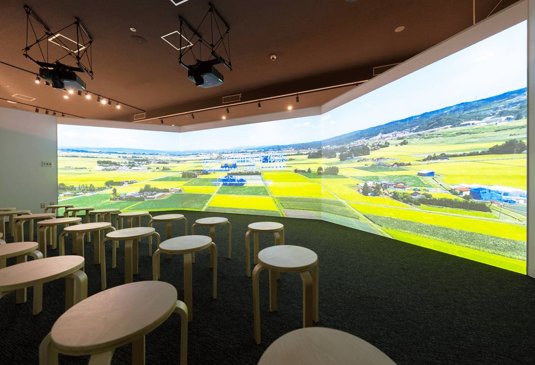 リニューアルの目玉の一つが、館内に新設されたミニシアターです。3面の大型スクリーンを用い、農業現場や研究現場の様子、農業機械の動きなどを、実物大に近い迫力ある映像で紹介しています。研究成果がどのような現場で使われているのかを臨場感をもって体感でき、農業研究をより身近に感じられる構成となっています。