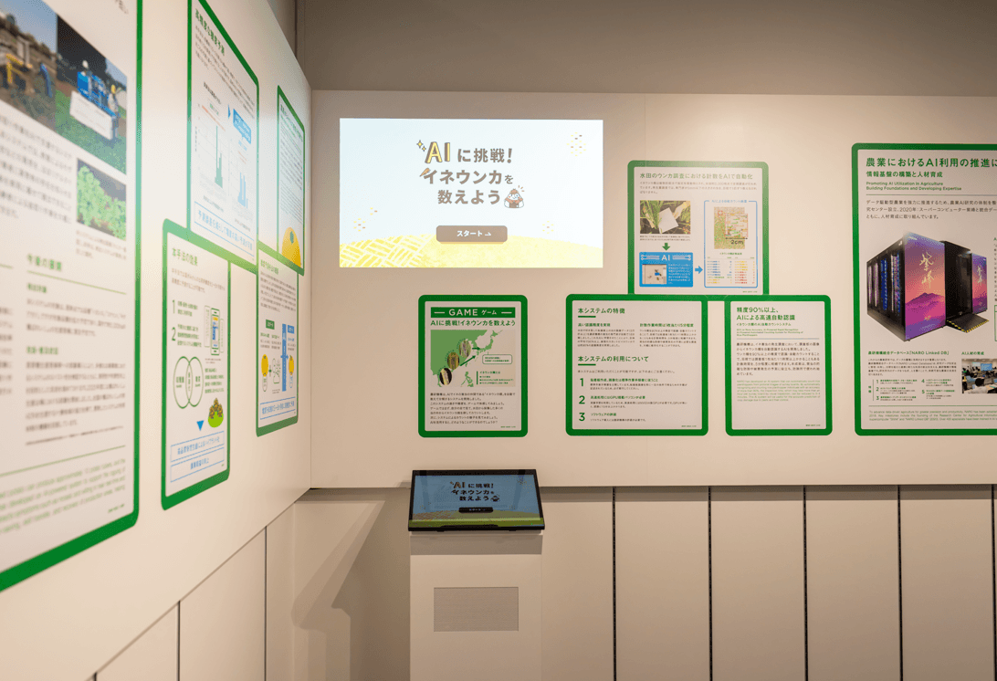 展示例の一つとして、AIを活用して水稲の害虫であるウンカをカウントする技術があります。画像の中からウンカを見つけて数える作業に、来館者自身がAIに挑戦する形で体験でき、AIが農業の現場で判断や作業を支援する仕組みを、楽しみながら理解できる内容となっています。