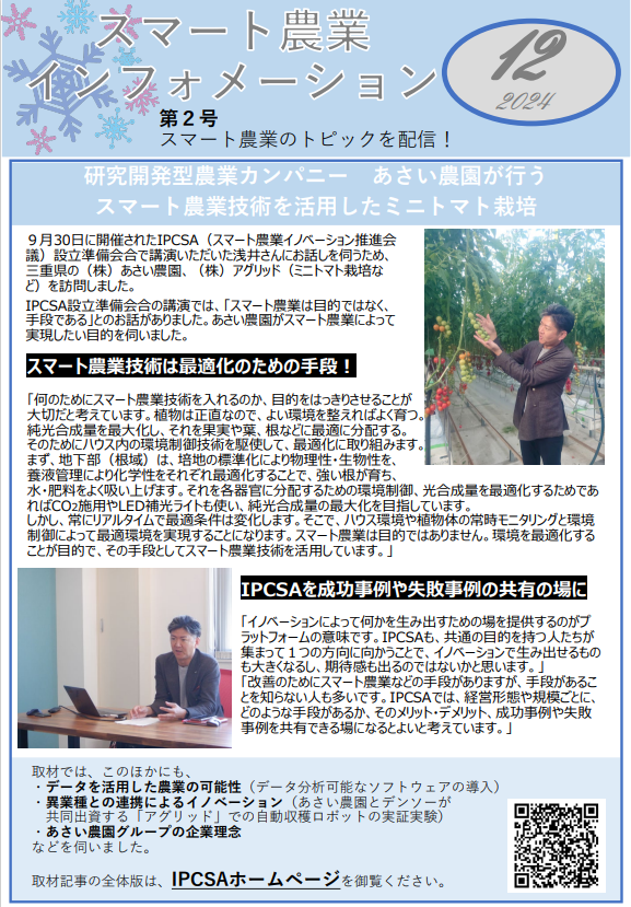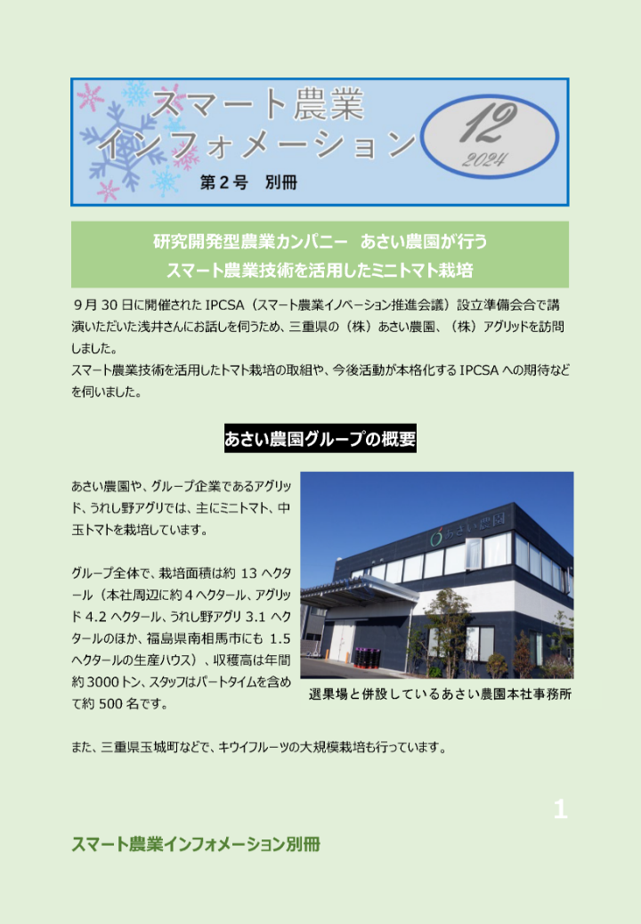 2025年 2024年 2024年 2024年12月 研究開発型農業カンパニーあさい農園の実践と学び 詳しく見る 2024年12月別冊 スマート農業技術は最適化のための手段!あさい農園のスマート農業 詳しく見る 2024年10月 スマート農業技術活用促進法が施行されました! 詳しく見る 関連情報に戻る